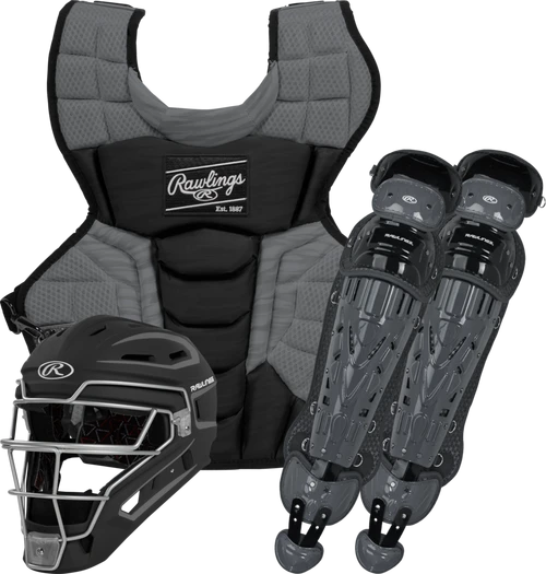 - Rawlings Senior Velo Catcher’s Protective Box Set includes a Velo 2.0 series catcher’s helmet, chest protector and leg guards